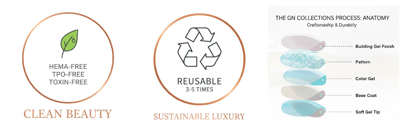 We use high quality Aprés soft gel tips.